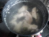 片手鍋に水、だしの素、鮭トバ1本(4分割)、
