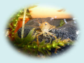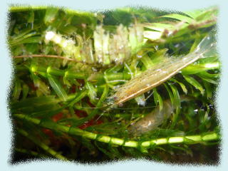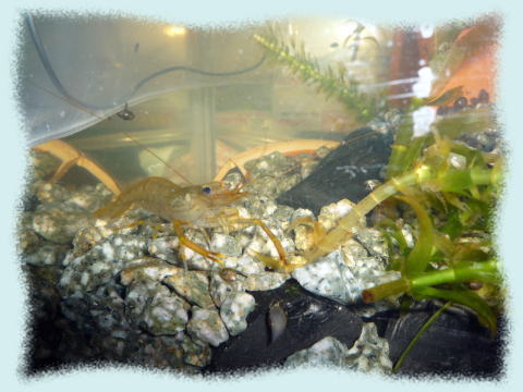 やや赤茶けてしまった(水温上昇による影響?)ヤマトヌマエビがいます。