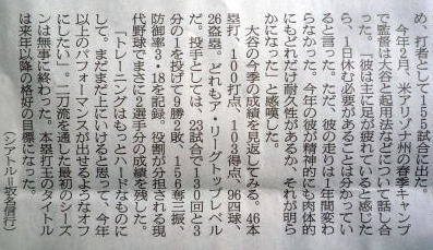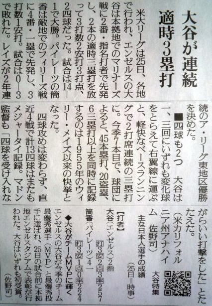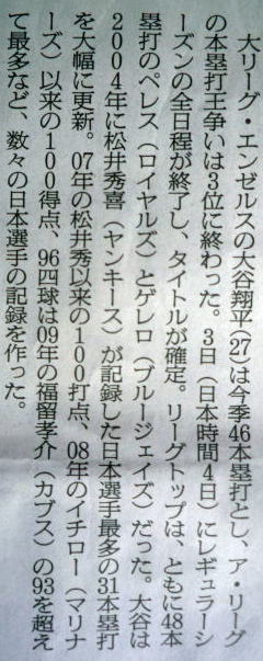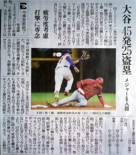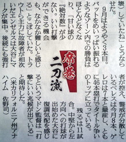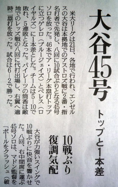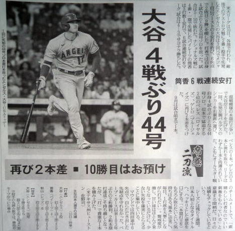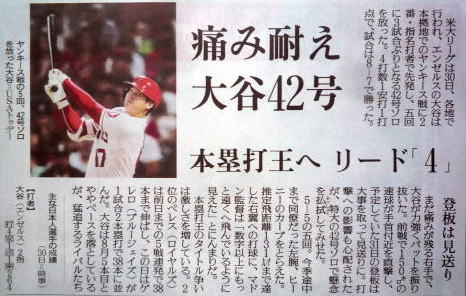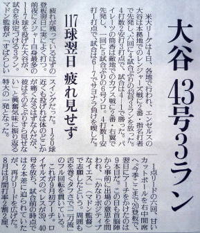 ↓大谷(エンゼルス)43号ホームランの記事。
