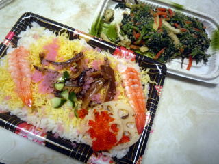 ので赤札の五目ちらしとほうれん草の胡麻和え