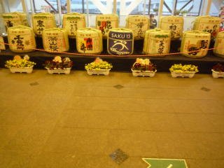 ↓佐久平駅構内の待合室前に飾ってあった酒樽。